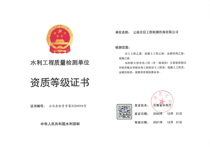 “水利工程質(zhì)量檢測單位乙級資質(zhì)”的取得,是云南省水利廳對云南合信公司檢測能力的充分肯定,標志著公司的服務能力進一步增強,綜合競爭力進一步提高,為公司跨領域、跨區(qū)域發(fā)展打下了良好的基礎。