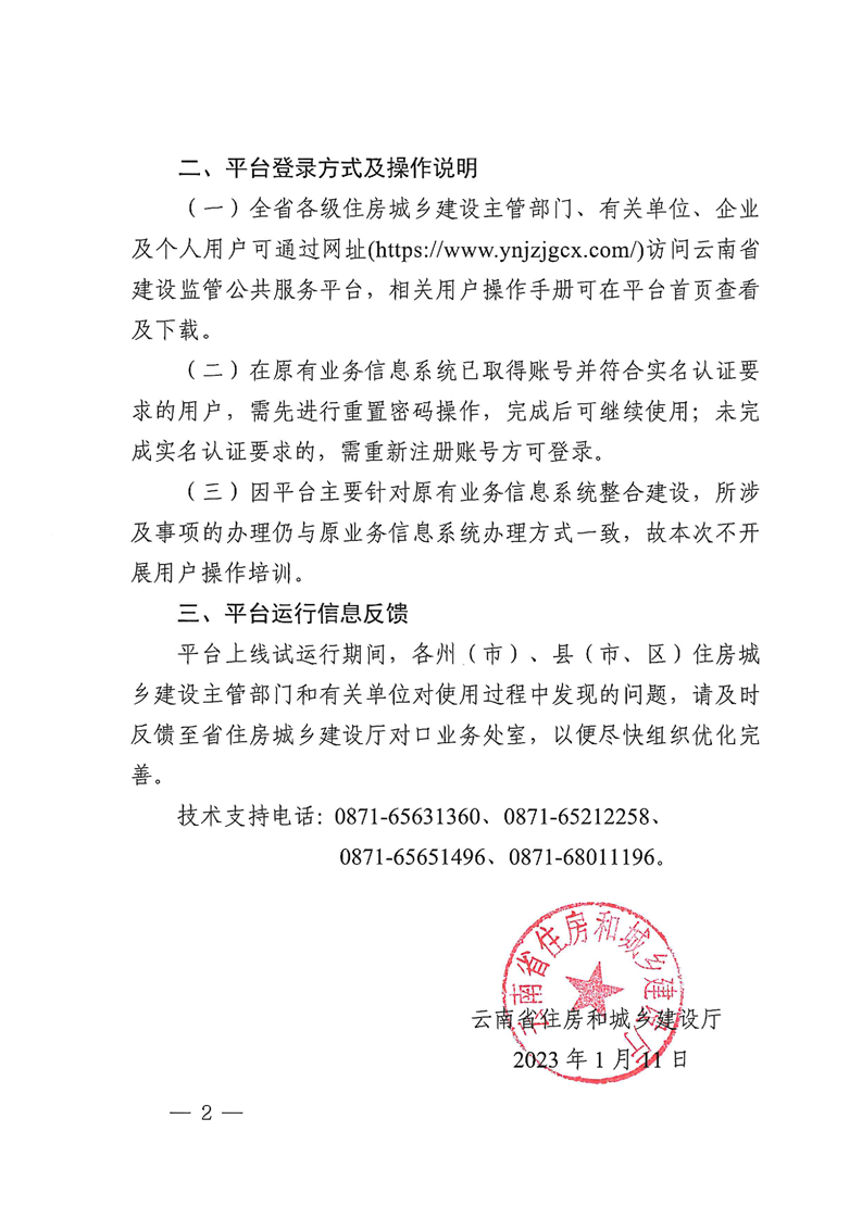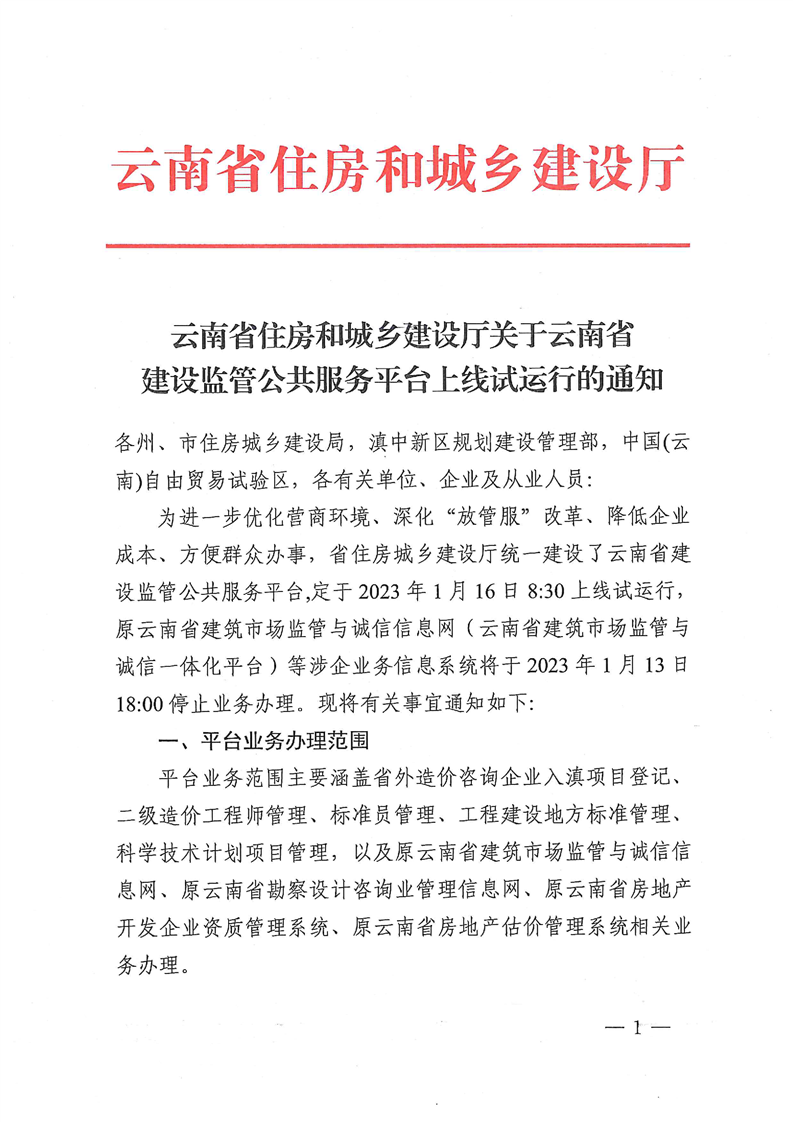 云南省住房和城鄉(xiāng)建設(shè)廳關(guān)于云南省建設(shè)監(jiān)管公共服務(wù)平臺(tái)上線試運(yùn)行的通知